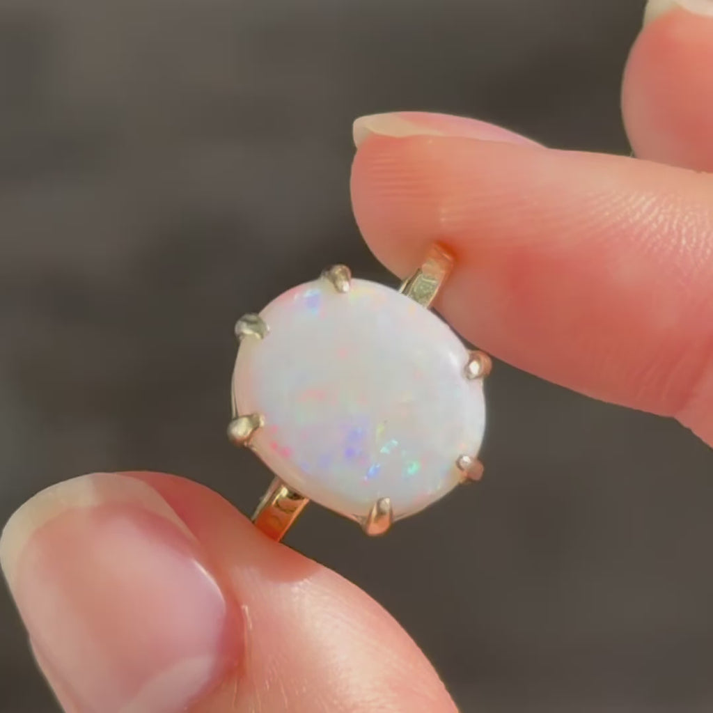 The Helene Ring. Alight with fiery opalescence and brilliant flashes of sun energy, Opal ignites insight. This handcrafted, one of a kind piece features a mesmerising South Australian Solid white Opal displaying a kaleidoscope of spectral colours captured in a six prong setting mounted on our signature square edged hammered band.