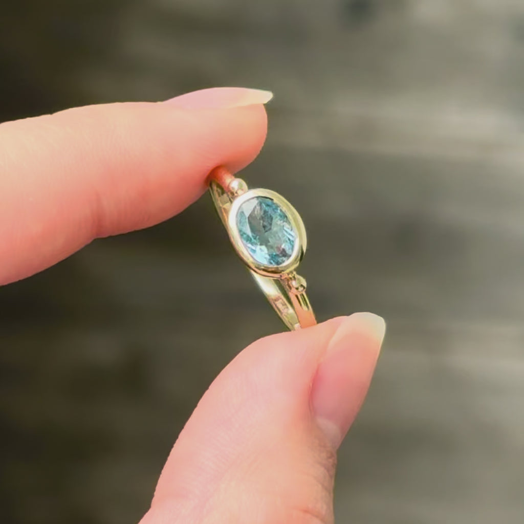 The Pippa Ring, classic and timeless featuring a radiant faceted Aquamarine. Handcrafted in an oval bezel setting with a half round edged band with granulated detailing. Intentionally designed to pair with beloved stacking bands.