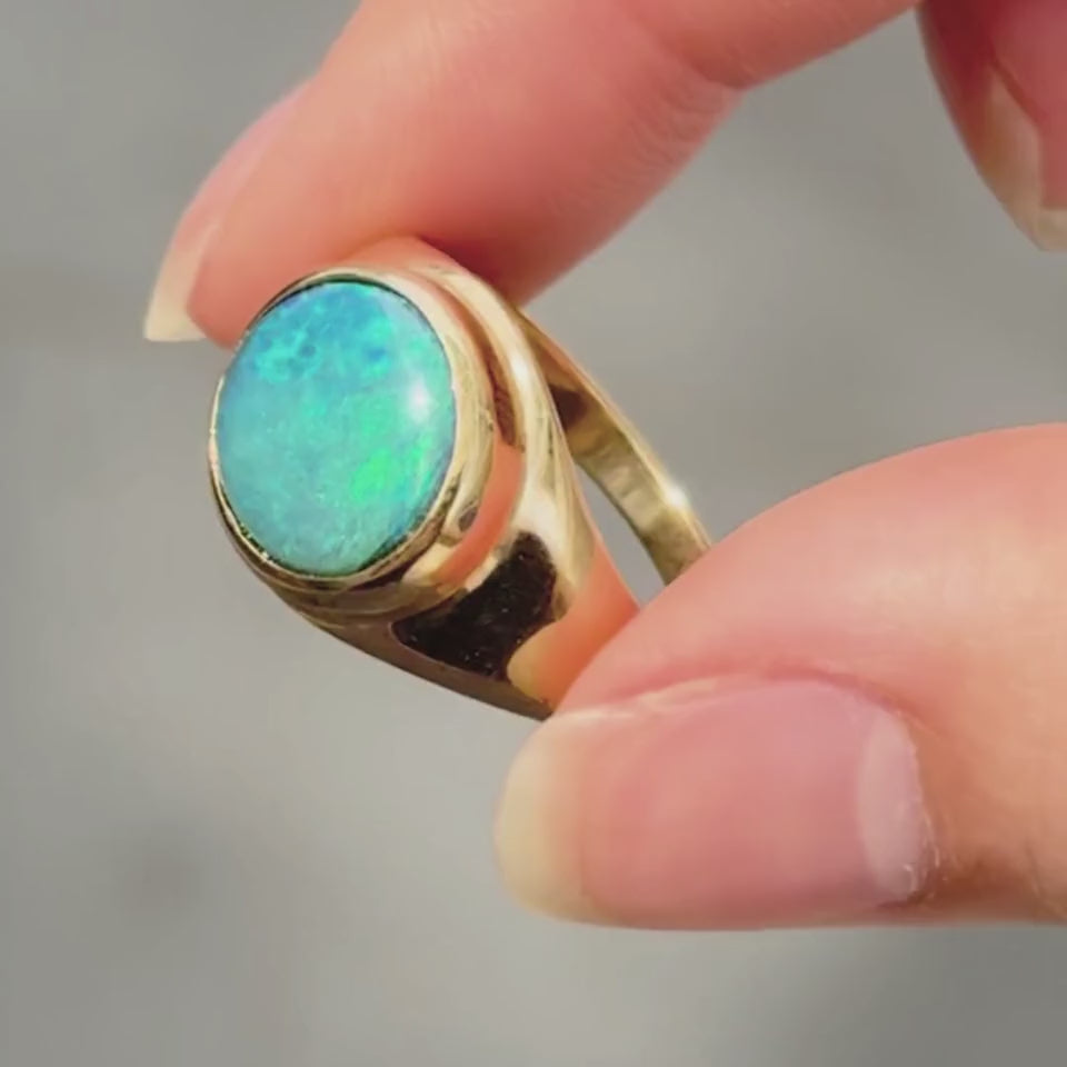 Historically known as an emblem of honour and connection, the signet style is an age-old form regarded as a powerful talisman. This unique one of a kind piece features a solid Lightning Ridge Black Opal handcrafted in a 9kt solid yellow gold bezel setting with a tapered band.