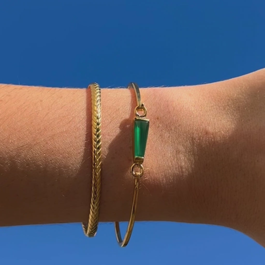 Honouring sacred geometry, the Trapezoid Bangle heroes a faceted trapezoid gemstone, set in a handcrafted half bezel setting and fine textured band. Style independently or layer with a range of wristwear to create our signature KR stack.